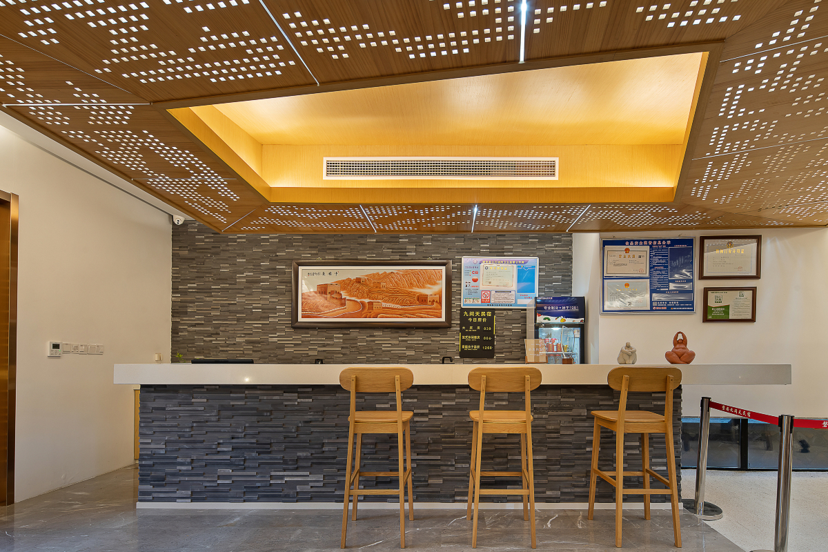 民宿位於磐安县尖山镇横路村(电视剧三十而已拍摄取景地),民宿周边都是白墙黛瓦的老宅子,石头铺就的墙面,斑驳的墙皮,是繁华市井里见不到的原始和质朴。九间天外观设计保留了老宅味道,房间设计则采用的是智能简约的现代化风格,每间客房都配有按摩浴缸、智能马桶、智能窗帘、免费长途电话、定制高级洗漱用品,部分房间还配备了投影设备。