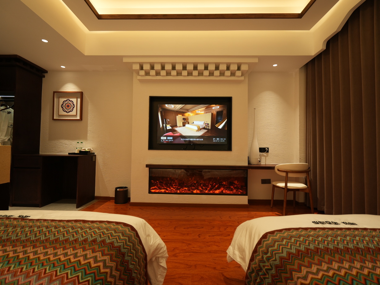 房间风格延续藏式图腾与原木温润的基调,墙面点缀手工挂画与藏式软装,配备仿真电壁炉、高级床品与厚实窗帘,为您提供一个温暖、静谧、极具美感的居住空间。部分房型拥有超大落地窗与景观视野,自然光洒满整个房间,清晨醒来便能感受到来自高原的阳光与宁静。