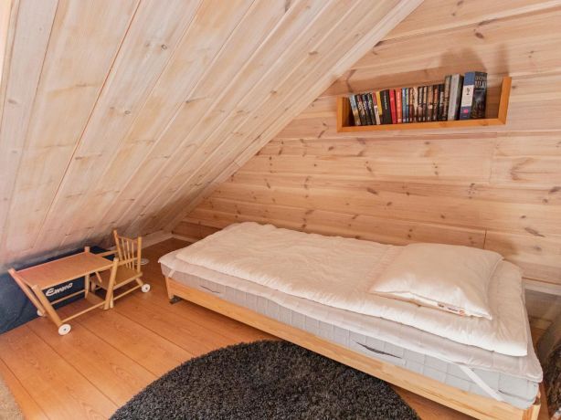Living room/kitchen, 1 small bedroom (double bed), plus 2 extra beds in the loft (10m2). Sauna (electrically heated), shower, toilet.